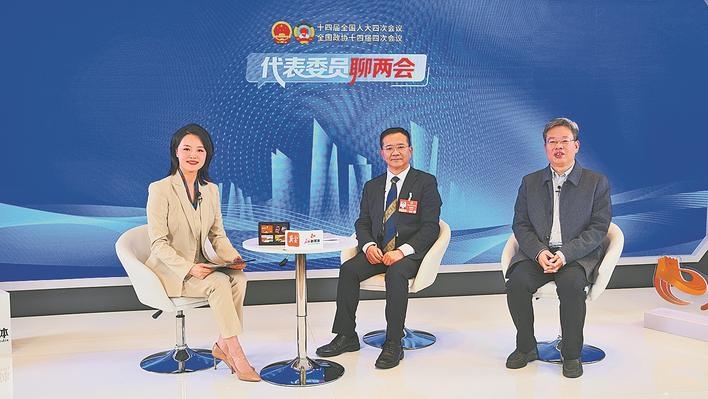 侯景滨(中)、叶堂林(右)做客“代表委员聊两会”演播室。