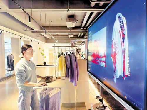 “这套系统突破了传统设计打样模式,通过AI智能创款,1分钟便能设计出一个新款。”电脑前,顾景亚轻点鼠标,选择款式、颜色、纱线种类等,很快,一款中国风女士开衫便以3D虚拟仿真的形式在电视大屏上立体呈现。将这件衣服的设计数据传输到旁边的电脑横机中,几十分钟后,样衣便能制作完成。