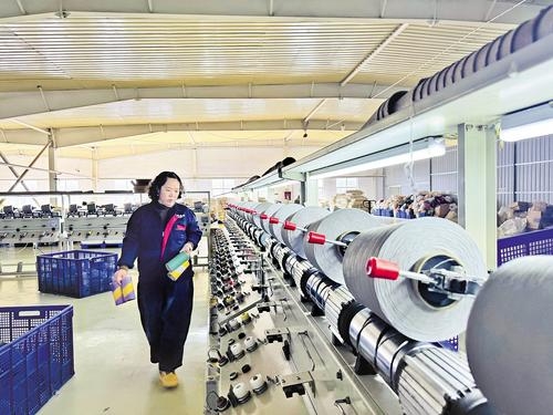 3月12日,清河县兴利智能针织共享工厂生产车间,工人在处理纱线。本报记者 常方圆摄