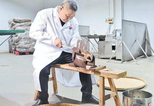 8月20日,在河北汉草堂药业有限公司,省级非物质文化遗产代表性项目安国中药材加工炮制技艺市级代表性传承人刘峰展示“蝉翼清夏”加工技艺。贾宗霖摄