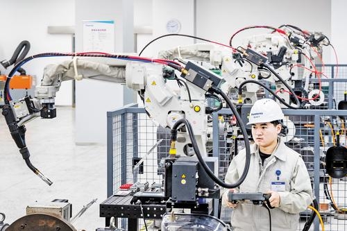 1月8日,唐山开元自动焊接装备有限公司技术人员在调试智能焊接机器人生产线。