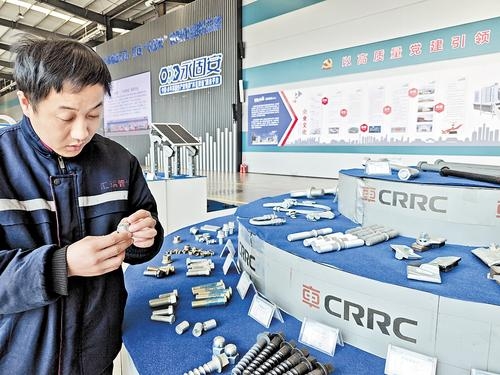 3月15日,在永固安共享智造平台展厅内,工作人员查看紧固件产品。 本报记者 魏 雨摄