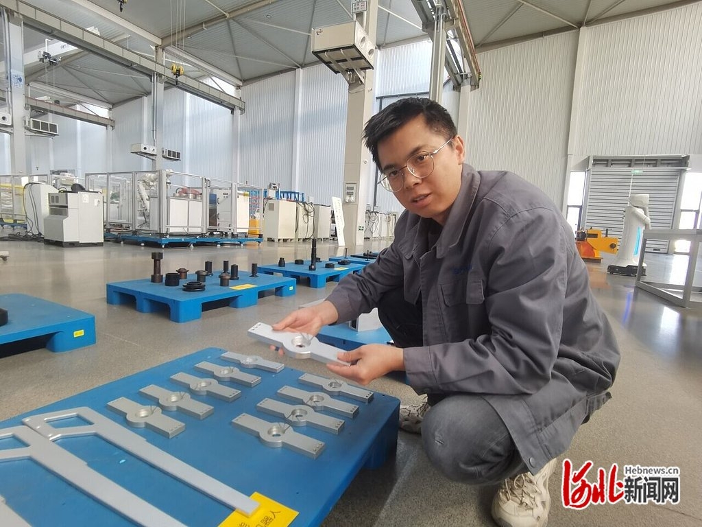 3月6日,百川集团工程师袁爱路介绍唐山百川机器人共享智能制造工厂为腐乳装瓶机器人制造的零部件。河北日报记者 李冬云摄