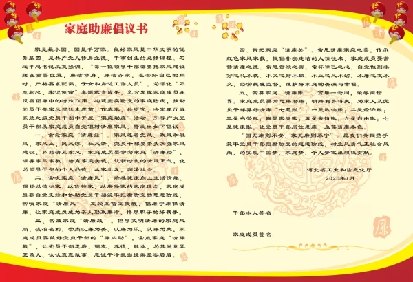 为深化“不忘初心、牢记使命”主题教育成果,充分发挥家庭成员在反腐倡廉中的特殊作用,构建拒腐防变的家庭防线,推动党员干部家风建设走在前、作表率。近日,河北省工业和信息化厅机关党委按照省直工委相关要求,在厅直系统处级干部中开展“家庭助廉”活动。