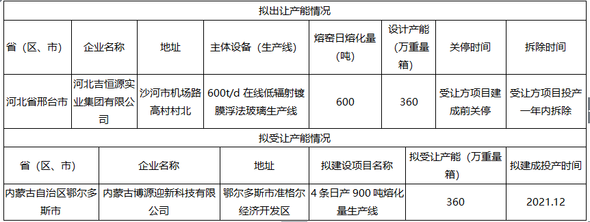 按照《国务院关于化解产能严重过剩矛盾的指导意见》(国发﹝2013﹞41号)和工业和信息化部《关于印发钢铁水泥玻璃行业产能置换实施办法的通知》(工信部原﹝2017﹞337号)要求,现将河北吉恒源实业集团有限公司平板玻璃产能出让方案予以公示,欢迎社会公众进行监督。公示期为2020年1月20日至2020年2月3日。