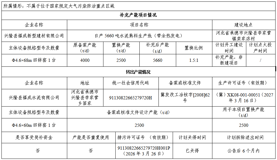 兴隆县福成新型建材有限公司日产5660吨水泥熟料生产线项目产能置换方案