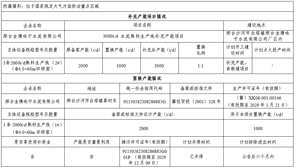 邢台金隅咏宁水泥有限公司日产3000吨水泥熟料生产线项目补充产能置换方案