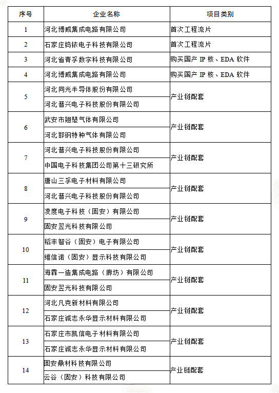根据河北省人民政府办公厅《关于支持第三代半导体等5个细分行业发展若干措施的通知》(冀政办字〔2023〕116号)、《关于征集第三代半导体、新型显示产业项目的通知》要求,经企业申报、市局推荐、专家评审、财务核查、会议研究等程序,拟对河北博威集成电路有限公司等14个项目给予支持,现予以公示。