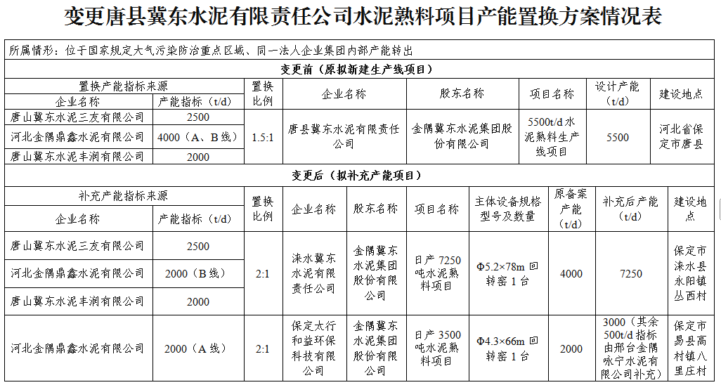 2021年7月9日,唐县冀东水泥有限责任公司5500t/d新型干法水泥熟料生产线项目产能置换方案在我厅门户网站公告,该项目因故不再实施。金隅冀东水泥集团股份有限公司拟将唐县冀东水泥有限责任公司项目置换产能指标补充至集团内涞水金隅冀东环保科技有限公司、保定太行和益环保科技有限公司生产线。按照《水泥平板玻璃行业产能置换实施办法(2024年本)》要求,现将变更情况予以公示,欢迎社会公众进行监督。公示期为2025年12月29日至2026年1月12日。