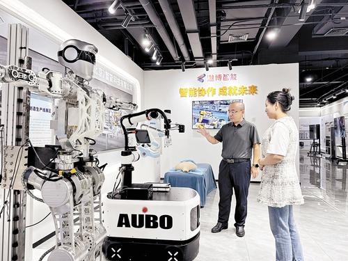 8月20日,在位于北京的中关村机器人产业创新中心,总经理蒙洋(左)向访客介绍展品。本报记者米彦泽摄