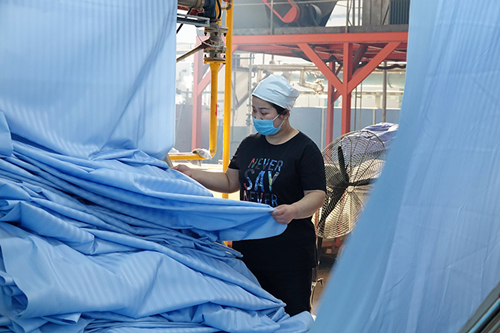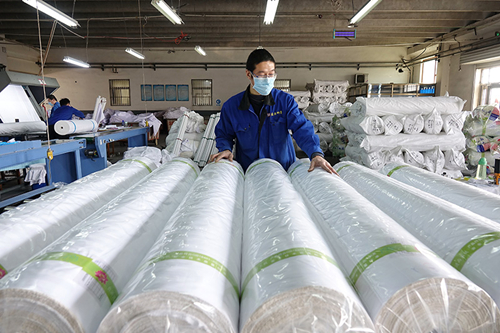 3月5日,河北省辛集市东方纺织印染有限公司的工人在整理医用面料成品。
