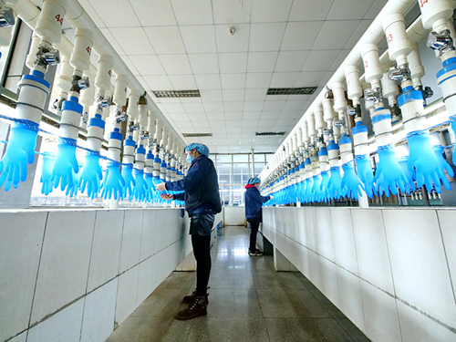 3月5日,石家庄鸿锐集团辛集工业基地的工人在车间内生产防护手套。