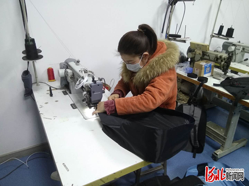 3月6日,保定盛世之星箱包制造有限公司生产车间里,工人佩戴口罩,正在进行生产作业。