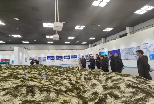 调研组在赛区规划临时展厅利用沙盘对监测网覆盖情况进行推演