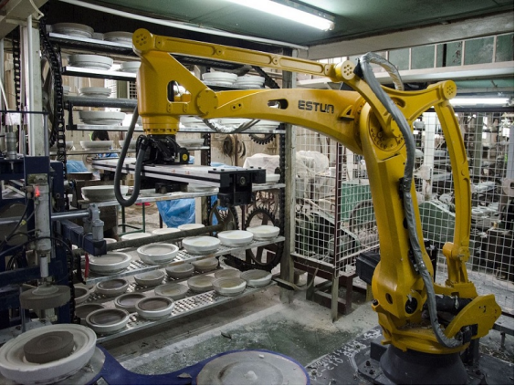 HIPHOENIX斯罗米克经由对日用陶瓷全自动智能柔性生产设备的关键技术研发,在陶瓷滚压成型生产中引入切投泥系统、机器人随动及夹持输送系统,以实现对重体力与技术性工作岗位操作员的替代。更对传统陶瓷工厂滚压成型机和链式干燥线的改造,使其能通过数据链接机器人和自动供泥系统,实现自动取放石膏模具、泥料自动输送、自动切泥、自动投泥、自动滚压而完全取代人工的工作,从而降低了工人的劳动强度、改善工人的作业环境、减少因劳动力不稳定或召工难而给生产企业带来的不便,并降低运营成本且提高生产效率。