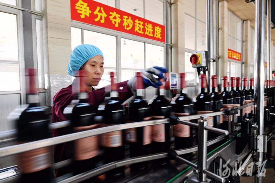 2020年11月4日,工人在河北省怀来县中国长城葡萄酒有限公司灌装车间忙碌生产。