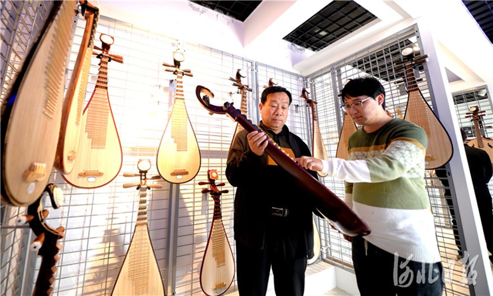 近日,河北省饶阳北方民族乐器制造有限责任公司展厅客商参观乐器产品。