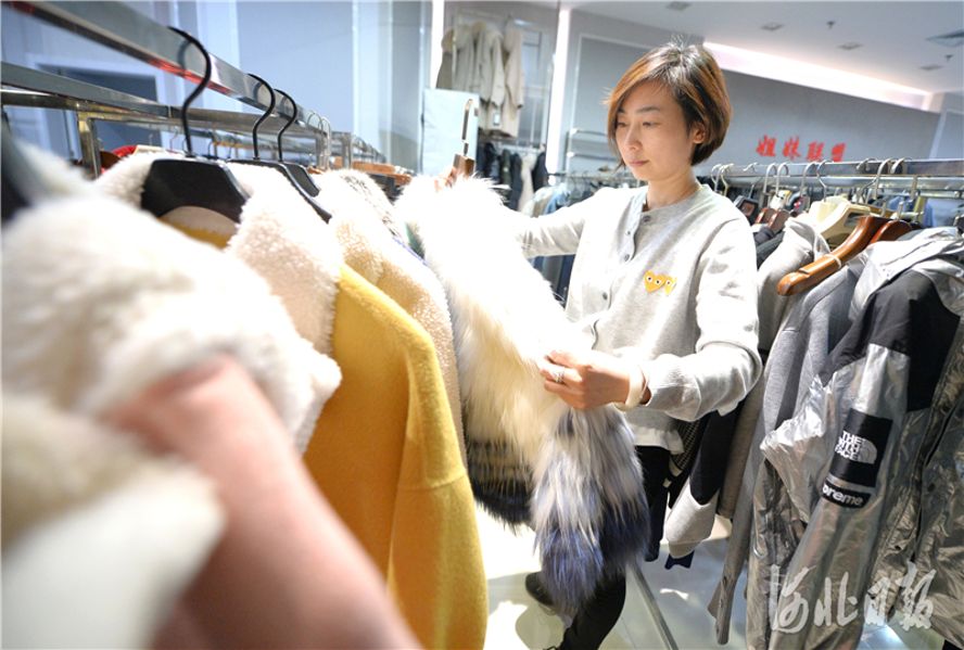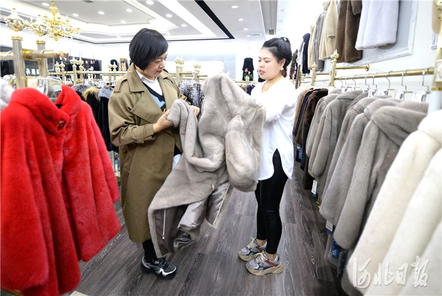 2020年11月5日,河北省肃宁县华斯裘皮商城员工为顾客挑选服装。