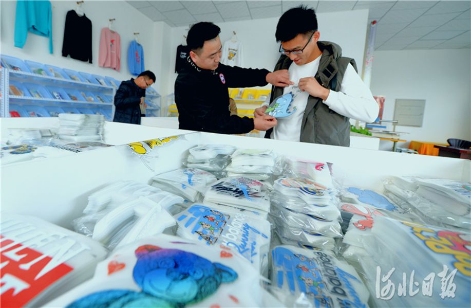 2020年11月5日,河北省肃宁县源发针纺产业园区一家电商员工为客人挑选商品。