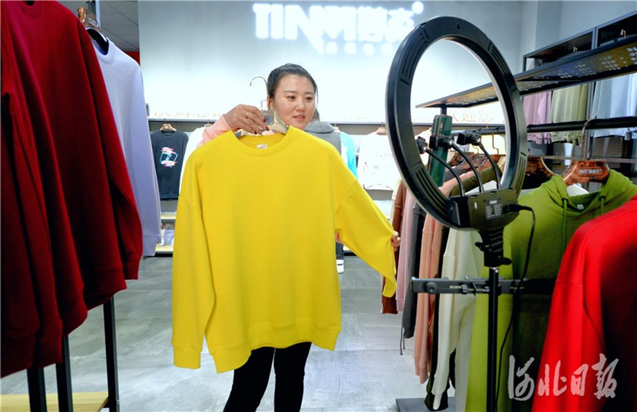 2020年11月5日,河北省肃宁县华斯电商基地利用网络直播带货,介绍商品。