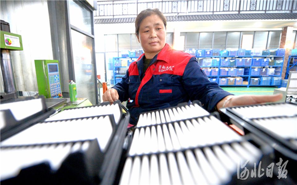 2020年11月20日,位于威县汽车工业配件产业园区的河北正灿滤清器制造有限公司的员工在加工产品。河北省威县不断加大汽配产业的技术改造和产品研发力度。目前,该县已有各类汽车及零部件制造企业近300家,涉及100多个品种的产品,年产汽车内饰件64万件(套)。