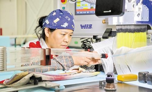7月15日,河北鹤煌网业股份有限公司工人正在进行丝网插接作业。 本报记者 李佳泽摄