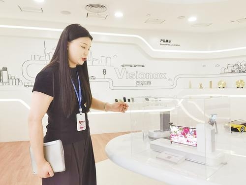 近日,维信诺(固安)显示科技有限公司工作人员介绍企业生产的柔性显示屏幕。本报记者李冬云摄
