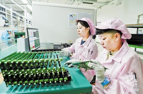 10月29日,汉旗电子科技(固安)有限公司员工在生产车间对监测设备印制板进行检测。吴迪摄