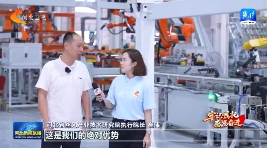 我们安平丝网规模大、品种多、市场广,这是我们的绝对优势,但是在生产过程方面也存在一些短板,比方说在焊接方面,我们的自动化水平低、人工焊接质量差,这又是我们大家的痛点。针对这些短板,我们联系了清华大学天津高端装备研究院,研发了这条智能化焊接生产线,生产效率是人工的7倍。